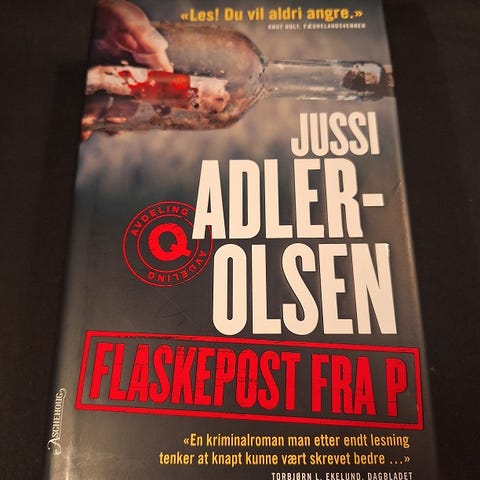 Jussi Adler-Olsen Flaskepost fra P bok, oversatt til norsk av Eirik Johansen Krogstad. Originaltittelen er Flaskepost fra P, utgitt i 2009. Boken er en del av en serie, trykket i Danmark og Norge. ISBN 978-82-03-21731-9.