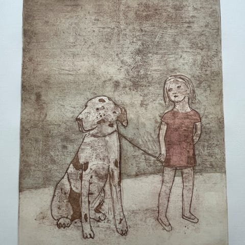 June Sira akvatint trykk fra tidlig i kunstnerens karriere. Tittgel:_ "Loft". Innrammet med smakfull ramme.
