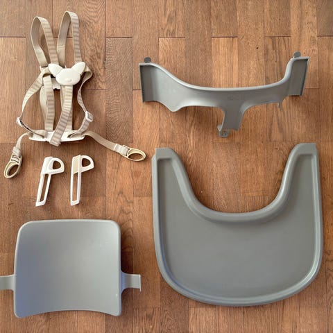 Stokke Høy barnestol tilbehør i grå farge. Inkluderer ulike deler til høy barnestol for tilpasning og bruk.