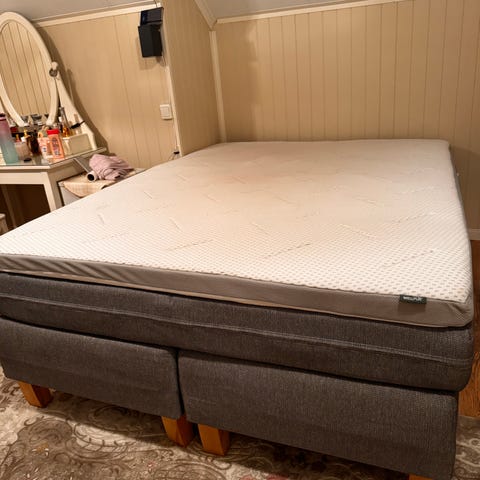 Meget pen og lite brukt seng. Kjøpt ny i august. Selges pga flytting. God og myk seng. Følger mer overmadrass. Ingen slitasje eller flekker.