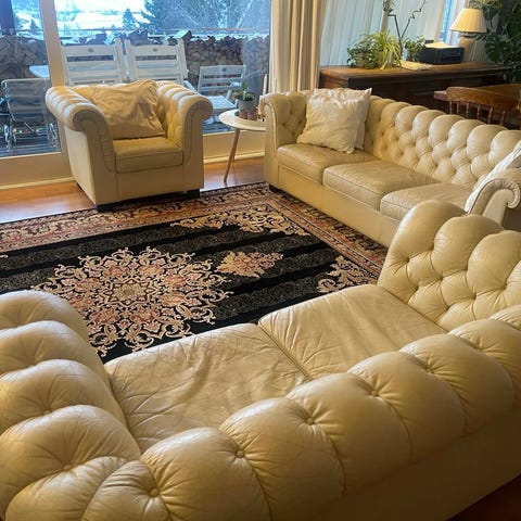 Ekornes skinn stuemøbler. Treseter sofa, to stoler og glassbord . Ingen flekker og ingen hull. Lite brukt.