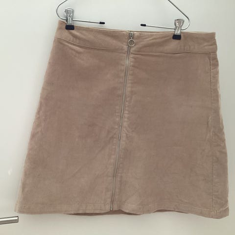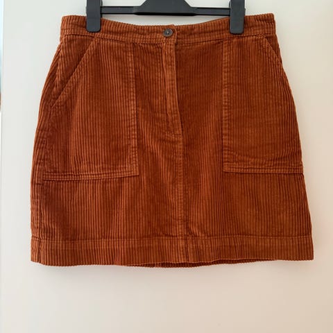 Jean Paul skjørt i brun farge, størrelse S, laget av bomull. Skjørtet har lommer og glidelås foran. Brukt en gang