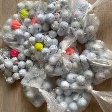 Samling av golfballer i forskjellige farger og merker. Egnet for bruk på golfbaner eller trening. Godt stand