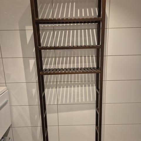 Denne stige-lignende hylla i massiv bjørk gir ekstra oppbevaringsplass og et særpreget utseende til badet