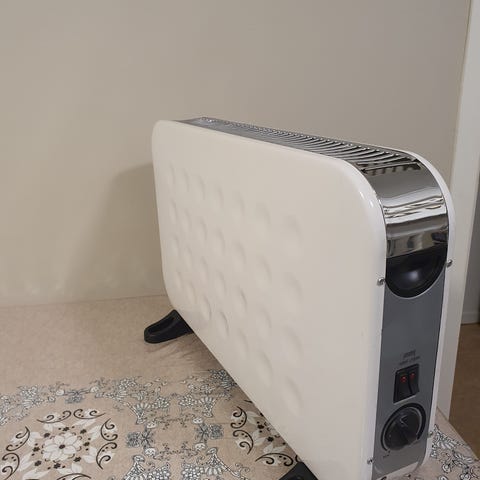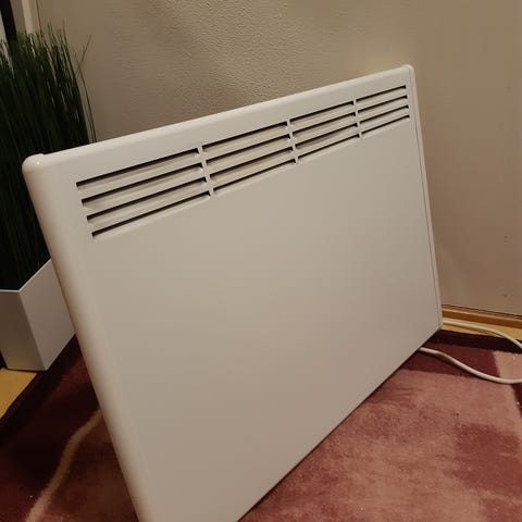 Panelovnen har et kompakt design med ventilasjonsåpninger på toppen for effektiv varmefordeling. Den er utstyrt med strømledning og føtter for stabil plassering på gulv. Egnet for oppvarming av mindre rom eller områder.