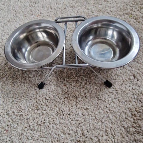 Som nye. Laget i keramikk så de er ganske tunge og står stødig på gulvet. Til hund. Vann og matskål matchende.