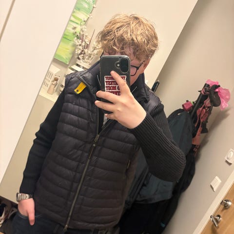 Vesten er i størrelse 164 / 14 år, men passer også fint for deg som vanligvis bruker S–M (mine størrelser) 💗