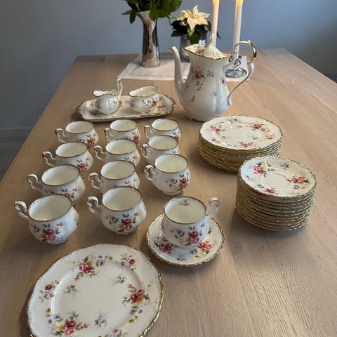Winterling Marktleuthen Bavarikaffeservise laget i porselen med dekorative gullkanter. Inneholder 3 sett med kopper, skåler asjetter og sukkerskål med lokk. Designet for servering av kaffe.