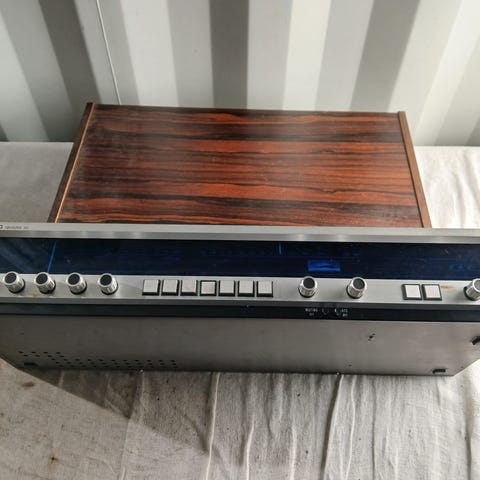 Vintage radio og forsterker med originale Tandberg høytalere i teak.