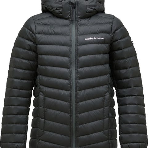Peak Performance jakke i størrelse XL, fargen svart. Laget av dun, egnet for utendørs bruk. Jakken har en rift på ryggen (se bilde). Glidelåsen er også litt treg, men fungerer ok