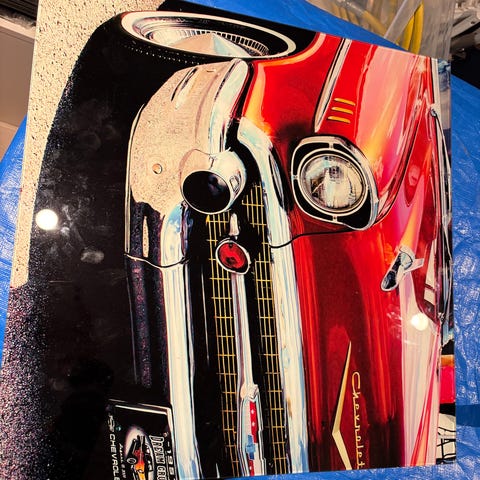 Bilde med motiv av rød Chevrolet og label "my place" på. Plastforseglet og nytt.