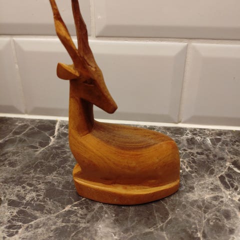Antilope figur laget av hardt, tungt tre. Nydelig tresort i fargen. Mål: 18 cm høy.