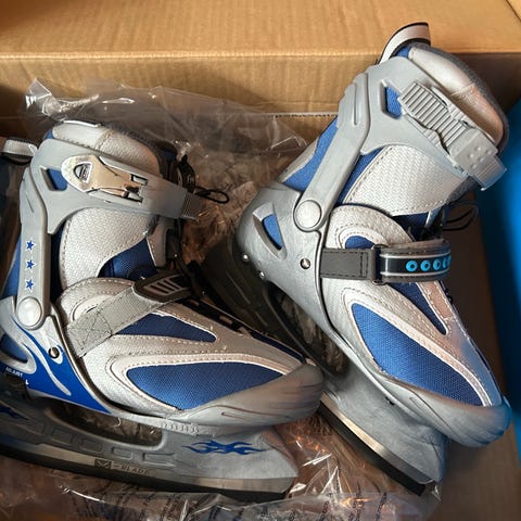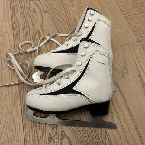 Oxelo kunstløpskøyter med pelskant i størrelse 33-34. Skøytene er hvite og har fôr for ekstra varme. Følger med beskyttelse for meiene.