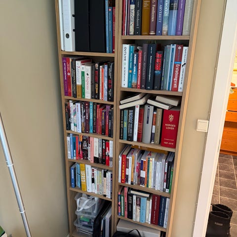 Billy bokhylle ned forhøyningsdel. Den ekstra delen kan taes av så hyllen er 202 cm høy. Har noen ringmerker på den ene hyllen - se bilde