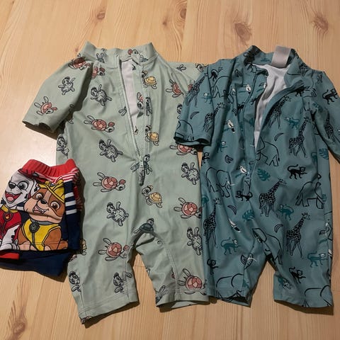 Badedress i størrelse 74/80, badehatt i str 46C og siste i str 1 år.