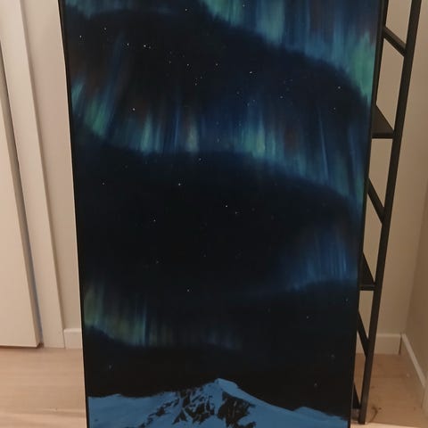 Er det noen interesse for et oljemaleri av Kirketaket i Rauma? 100x50cm. Fargene i nordlyset er litt mer "nordlys-grønt" enn det oppleves på bildet. Leveringsklart fra imorgen ettermiddag(nyttårsaften). Har noen få siste detaljer som blir ferdig idag. Ta kontakt ved interesse