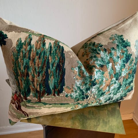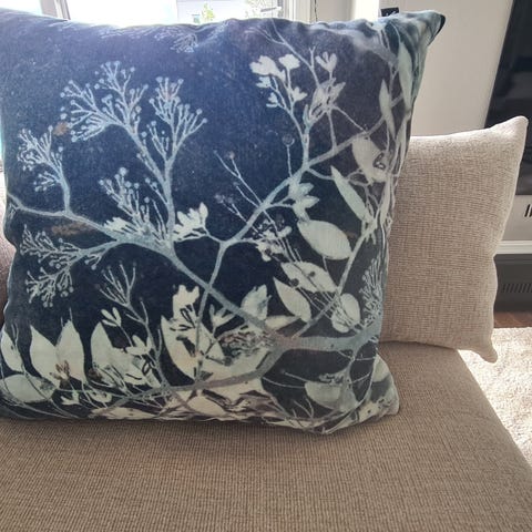 Vakre puter i blått og hvitt toile stoff fra Laura Ashley, kjøpt i England. Hvit lin bakside og forskjellige klassiske motiver på forside. Kraftig kvalitetsstoff, i fin stand og med god gliselås. Komplett med innerputer. Kan vaskes.