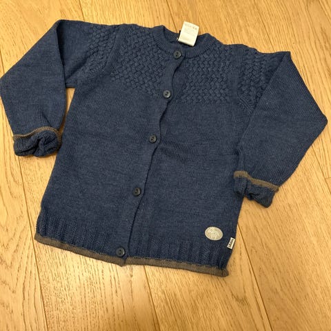 Lindex genser i størrelse 86. Den har et mønster med små blomster og ribbestrikkede kanter ved ermer og hals.
