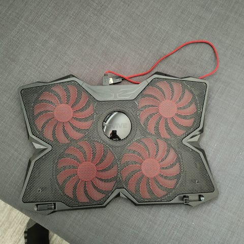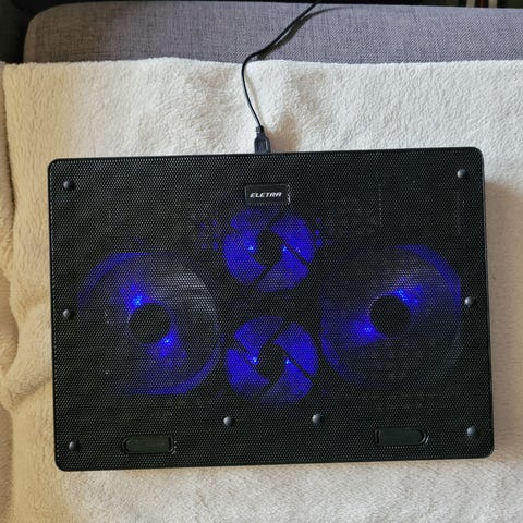 Kjøleputer til bærbar PC med fire vifter. Designet for å forbedre luftstrømmen og kjølingen under bruk. Utstyrt med USB-kabel for tilkobling til datamaskin.