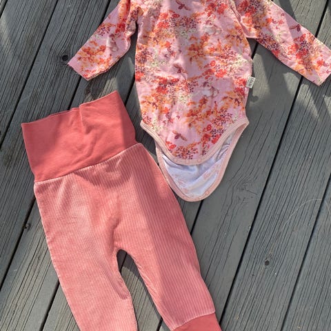 Wheat barneklær i størrelse 86, oransje farge. Sett bestående av overdel med blomsterprint og matchende bukse. Bodyen har fått noen flekker, se bilde. Pga mønsteret viser det lite.