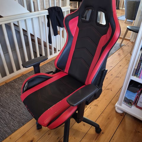 Flott gamingstol med mange muligheter innstillinger gis bort mot henting. Mener å huske at den kostet mellom 2000-3000 ny. Bruksmerker i setet, men har ingenting å si for funksjon, har selv bare hatt et pledd på, se bilde. Flott stol!