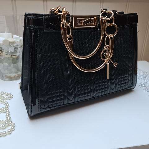 River Island dameveske laget av kunstlær i rosa farge. Vesken har et strukturert mønster som etterligner krokodilleskinn. Utstyrt med to håndtak og en avtagbar skulderrem med merkede detaljer.