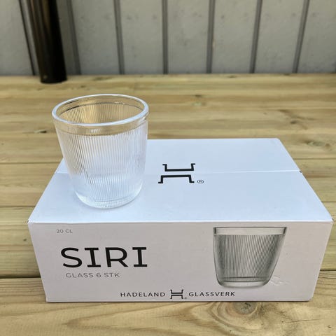 Hadeland Glassverk Siri-serien glass på stett laget i klart glass med vertikale linjedetaljer. Settet består av 8 glass.
