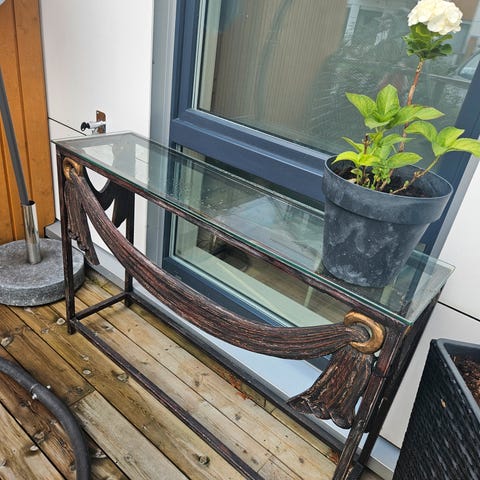 Et elegant og komfortabelt trebord med glassplate. Bordet har et vakkert design og passer perfekt inn i moderne og stilrene interiørløsninger i hjemmet.