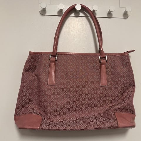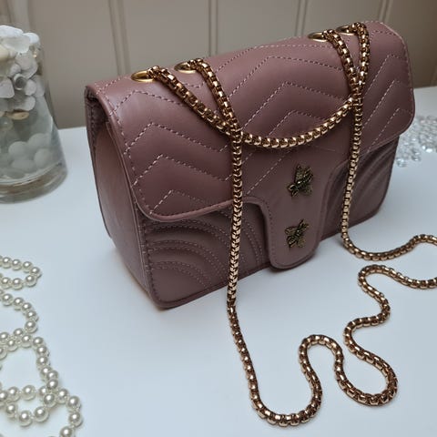 To søte veske i kunstlær for dame. Vesken har en quiltet design og er utstyrt med en kjedestropp i metall.