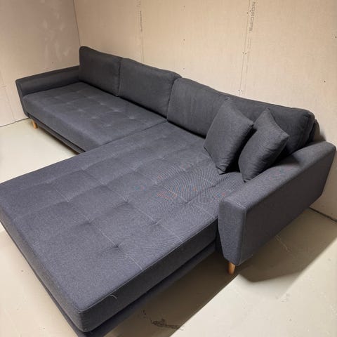 Nydelig mørk grå sofa, ser svart ut, med fotskammel og to runde eikebord selges. Alt er meget godt tatt vare på og fremstår som nytt.