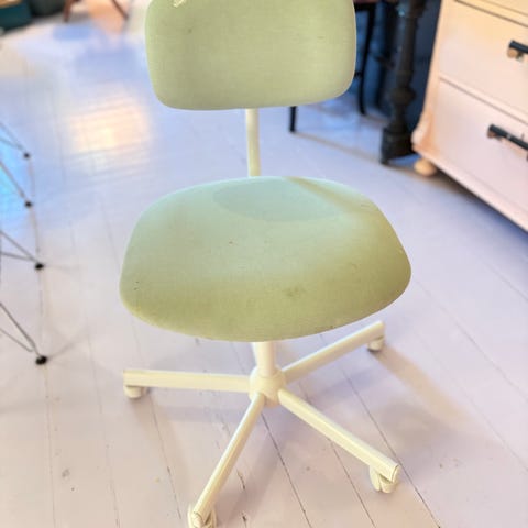 Det ene armlenet er litt løst, må fikses, og trenger en vask. Ellers fin og hel