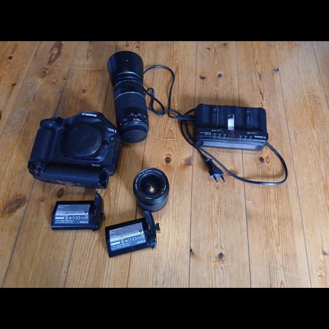 Kamera utstyr som min far hadde som hobby, har blitt liggende i mange år, så no må det selges, har ikkje greie på sånt, men den store objektive trur jeg han aldri feff bruke,så den er som ny, men dei to andre kan man se at er bruka, å så er det ein blidts, men vanskelig å komme me så mange spørsmål, for dette kan eg ikkje noe om . Se bilder.