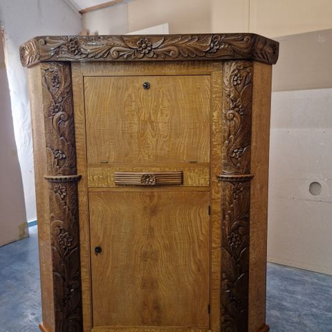 Fint dekorativt antikt skap. Romslige hyller og barskap. Alle nøkler fungerer.