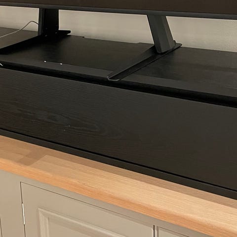 IKEA benk med hyller, laget av tre og med grå dører. Passer til oppbevaring i hjem. Har flere hyller og åpne hyller for organisering av ledninger til Tv, playstation etc.