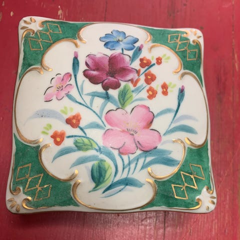 Koselig porselen smykkeskrin, med velfungerende lokk og pent motiv