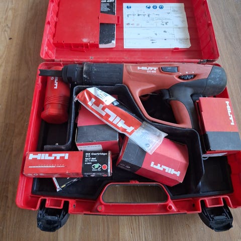 Hilti DX 76 spikerpistol i rød og svart med tilhørende oppbevaringskoffert. Verktøyet er designet for spikring i ulike byggeprosjekter og leveres med nødvendige tilbehør for funksjonell bruk.