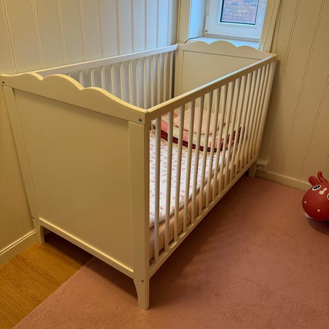 IKEA Sprinkel barneseng i hvit farge. Sengemål: 60 cm x 120 cm. Veldig koselig og litt herskapelig seng som er veldig stabil. Sengen er i god stand, men noen bruksmerker er det (derav kategori synlig brukt). Kjøpt i 2021. Demontert. Bunnen kan justeres i to høyder for lettere å komme til barnet når det er lite. Madrass fra IKEA kan følge med om ønskelig. Bunnen er av den nye typen, som gjør at det blir tilstrekkelig lufting under madrassen.