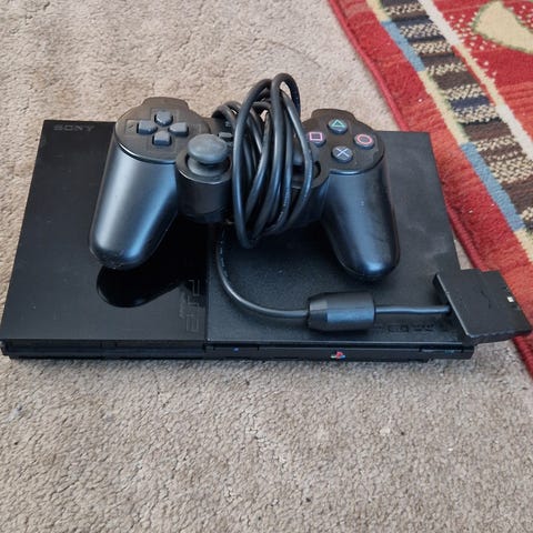 PlayStation 4 spillkonsoll i svart farge. Konsollen har standard design og er beregnet for bruk med PlayStation 4-spill og tilbehør