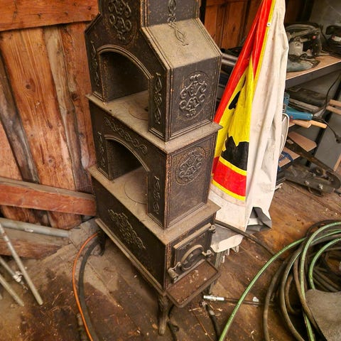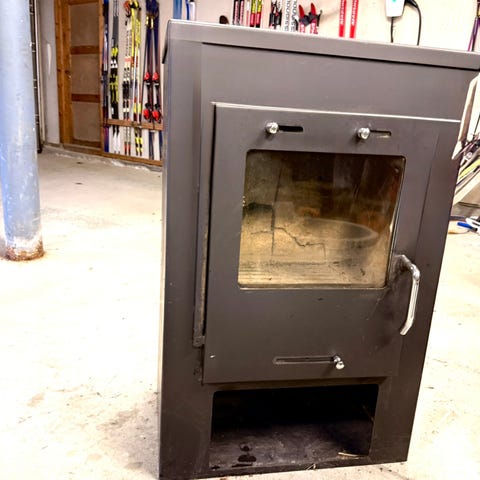 Wiking Interseroh vedovn laget i stål med glassdør for innsyn til flammene. Egnet for oppvarming av rom med ved som brensel.