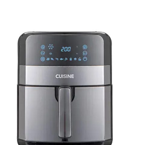 Air fryer i rustfritt stål med digitalt display for temperaturkontroll. Inkluderer uttrekkbar kurv med håndtak. Egnet for matlaging med varmluftsteknologi.