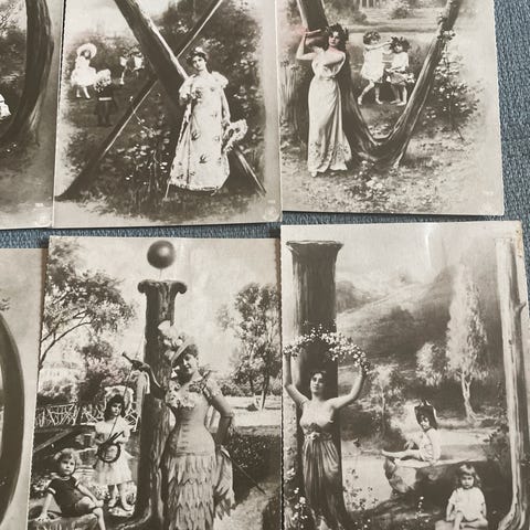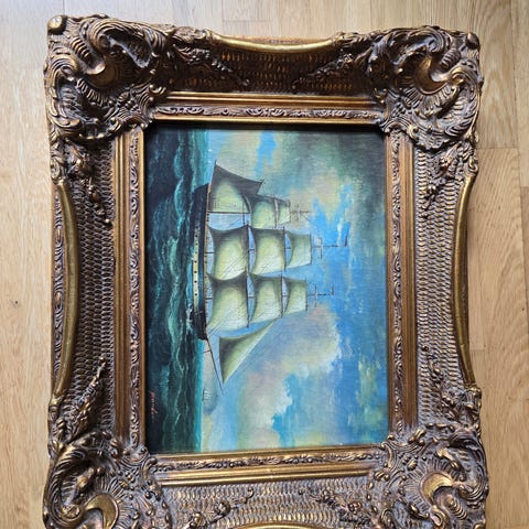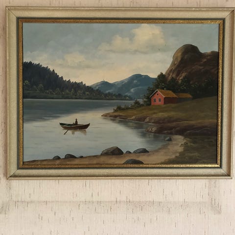 Maleri som viser en innsjø med en person i båt og en annen på en brygge, omgitt av trær og hus i bakgrunnen. Inkluderer en ramme med dekorative detaljer.