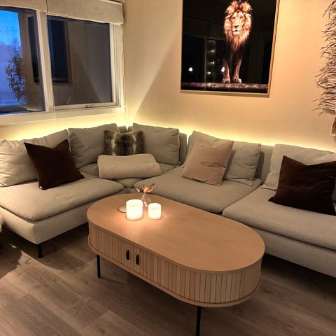 Kan være behjelpelig med levering for ein liten sum. Sofaen kan demonteres ved å ta av rygger, armlener og bein. Da er den lett å frakte.