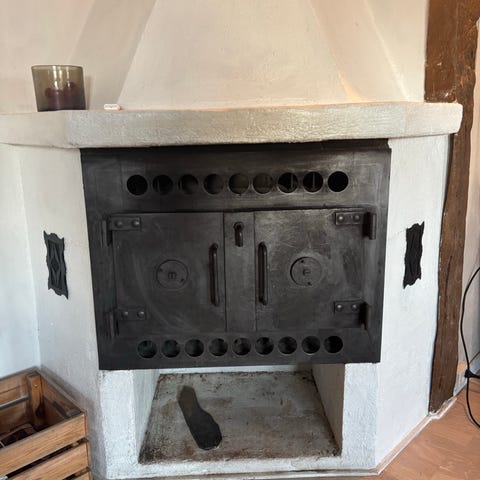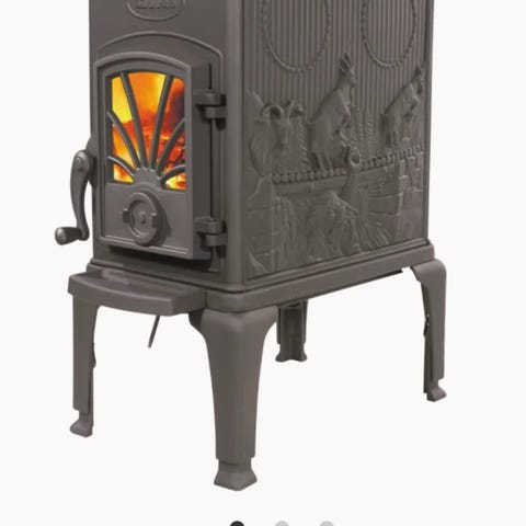 Dovre Vedovn med hvit overflate, glassdører og plate i stein foran. Egnet for oppvarming av rom. Designet for bruk med ved som brensel.