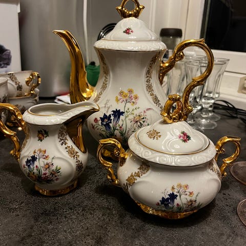 2 kaffekopper med fat, alt er som ny, bortsett den ene koppen , som har fått hakk under( se bilde)