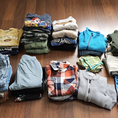 Pakken inneholder fem ulike T-skjorter, syv gensere, deriblant en rød Polo genser fra Ralph Lauren (str. 7år), tre bukser, tre shortser, en fleecejakke og en skinnjakke (str. 122).