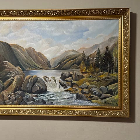 Er det noen interesse for et oljemaleri av Kirketaket i Rauma? 100x50cm. Fargene i nordlyset er litt mer "nordlys-grønt" enn det oppleves på bildet. Leveringsklart fra imorgen ettermiddag(nyttårsaften). Har noen få siste detaljer som blir ferdig idag. Ta kontakt ved interesse