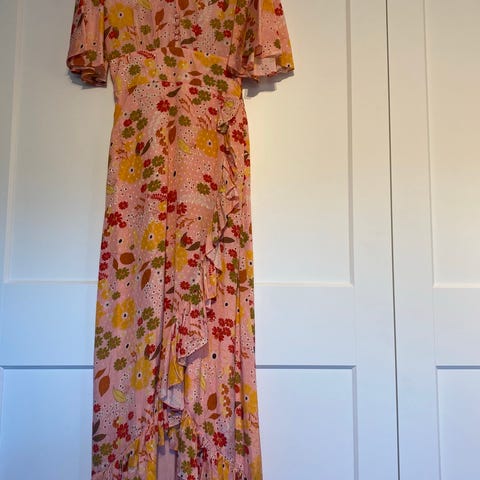 Kjolen er laget i en viskosekvalitet med en diskré glans. Kjolen har midi-lengde, rund hals, en tettsittende silhuett rundt midjen og hoftene og utsving nederst. Toppen har rynker i halsen og under bysten, og de lange, voluminøse ermene har puffede skuldre og elastiske mansjetter. Den lukkes i siden med glidelås.