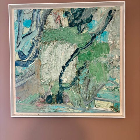 Elegant avlangt maleri med sort sveve-ramme. Sprek grønn og rosafarver. Signert, originalpris kr 8000,-. Må hentes i Oslo. En av kunstnerens mest kjente motiver.