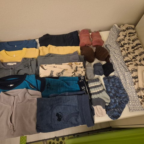 Pyjamas, genser, bukser, body, sokker, smekker, badetruse, badesokker, strømpebukser. Vårjakke, ulltøy