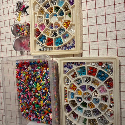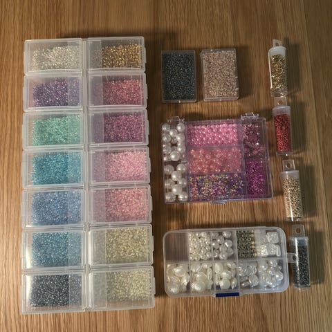 Et utvalg av perler i forskjellige farger og størrelser, egnet for hobby- og håndverksprosjekter.